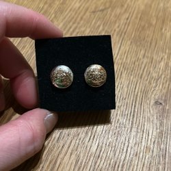 Ett par örhängen med ett unikt mönster i grått, guld och svart. Perfekt för att komplettera din stil.