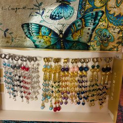 Ett par örhängen med blommor och hängande detaljer. Perfekt accessoar för att komplettera din stil.
