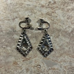 Ett par örhängen med olikformade hängen. Den ena är oval och den andra är triangulär. Båda har en flerfärgad sten.