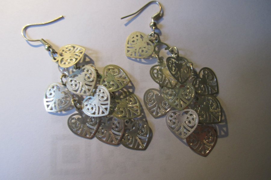 Ett par örhängen med hängen i form av hjärtan med utskurna mönster. Örhängena har krokar för att fästas i öronen.