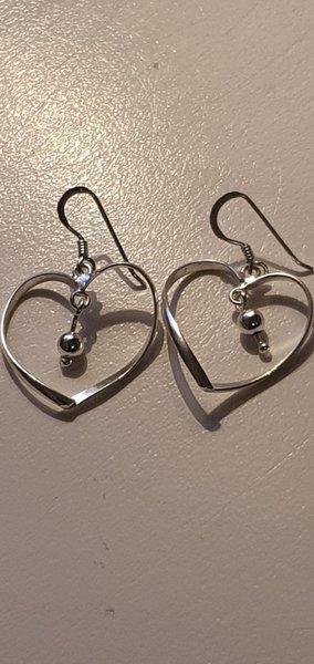 Ett par örhängen i form av hjärtan med en liten silverfärgad pärla hängandes inuti.