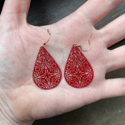 Ett par röda örhängen i form av blommor med glitter.