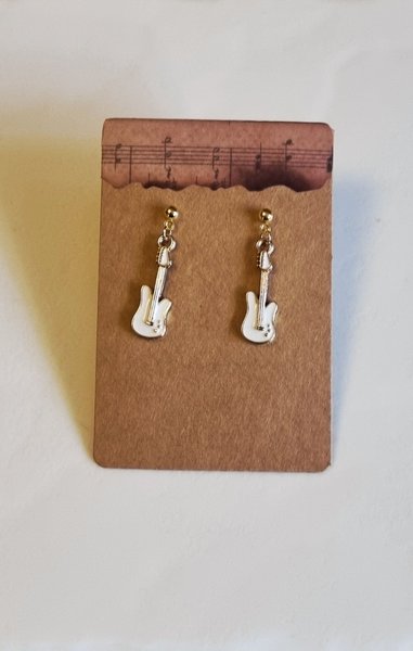 Ett par örhängen i form av gitarrer. Guld med vit enamel. Krockar är nickelfri. Perfekt för musikälskaren!