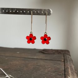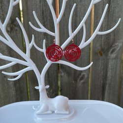 Ett par röda örhängen i form av blommor med glitter.