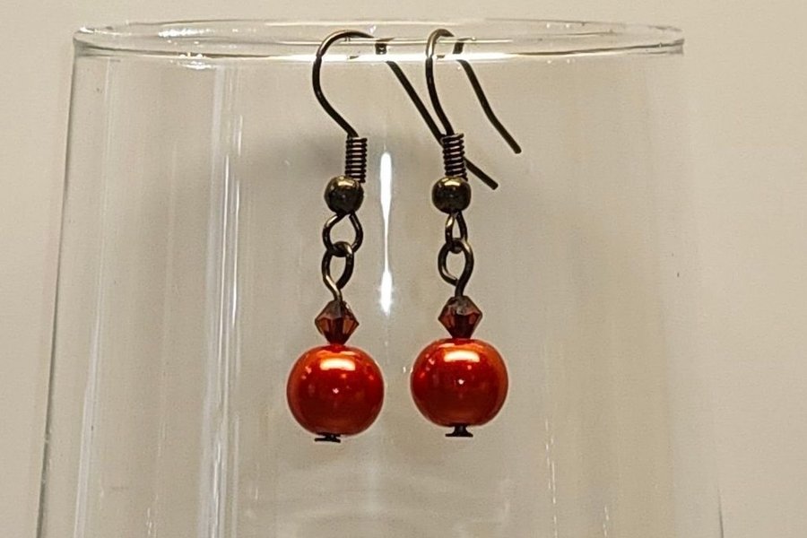 Örhängen med röda pärlor och svarta detaljer. Handgjorda och oanvända.
