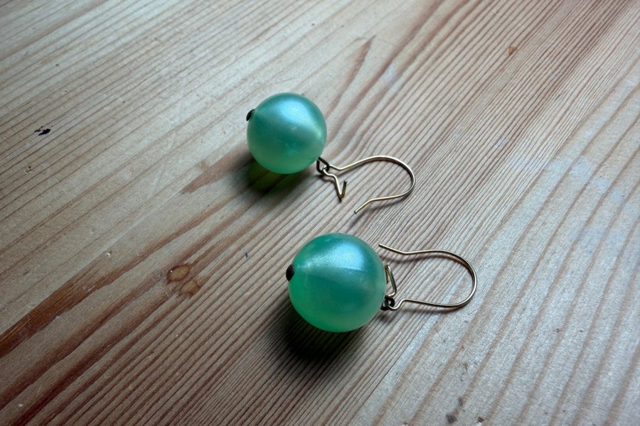 Örhängen med pärlemorskimrande ljusgröna pärlor. Ca 12 mm i diameter