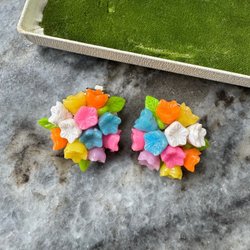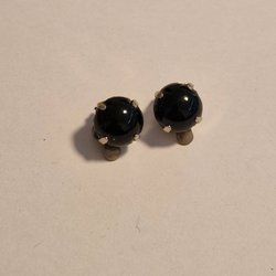 Två par svarta clip-on örhängen. Ett par runda i plast och ett par i form av en blomma i plast med metallclips.