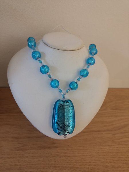 Fin, färgglad halssmycket, turkos glas. Kan hämtas också i Odenplan.