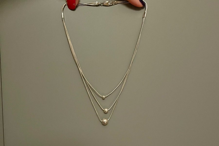 Ett elegant halsband med tre tunna kedjor i olika längder. Varje kedja har en silverfärgad kula, vilket ger halsbandet en stilren och modern look.