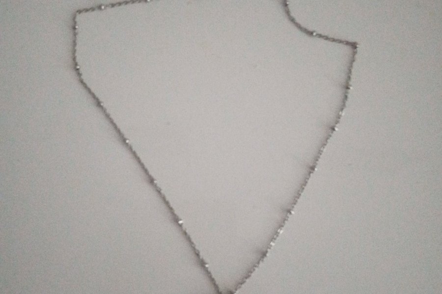 Ett fint halsband med ett hjärta som hänge. Kedjan är silverfärgad och har små kulor längs med.