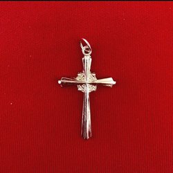 Litet silverfärgat hänge i form av ett kors i snirklig stil med en sten i mitten. Material okänt men gissningsvis ett starkt skyddande lager runt smycket eftersom att den behållt sin fina glans sedan inköpet.