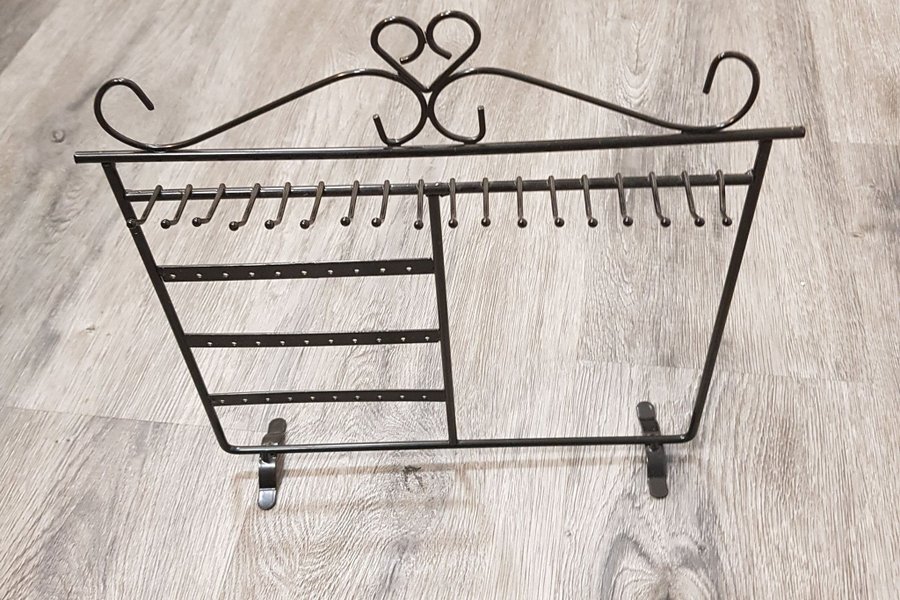 Smyckeshållare i metall för förvaring av örhängen och halsband. Höjd ca 28cm bredd ca 29,5cm. Porto gäller endast inom Sverige