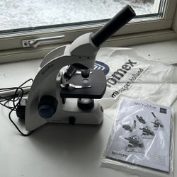 Mikroskop med svart stativ och silverfärgad tub. Justerbar spegel för ljusinsläpp. Okular medföljer.