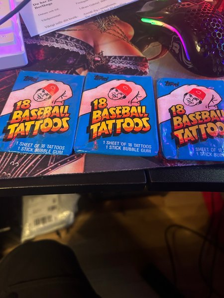 Tre förpackningar med Topps Baseball Tattoos. Varje förpackning innehåller en ark med 18 tatueringar och ett tuggummi.