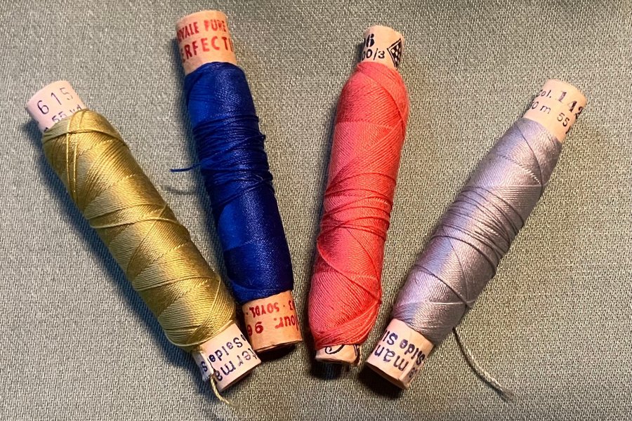 Enl bilder. Alla är Gütermann utom den klarblå. Det står 100/3 på alla. Färger från vänster t höger: 615, 960, 896, 142. Det är taget på den klarblå. Kanske på övriga.