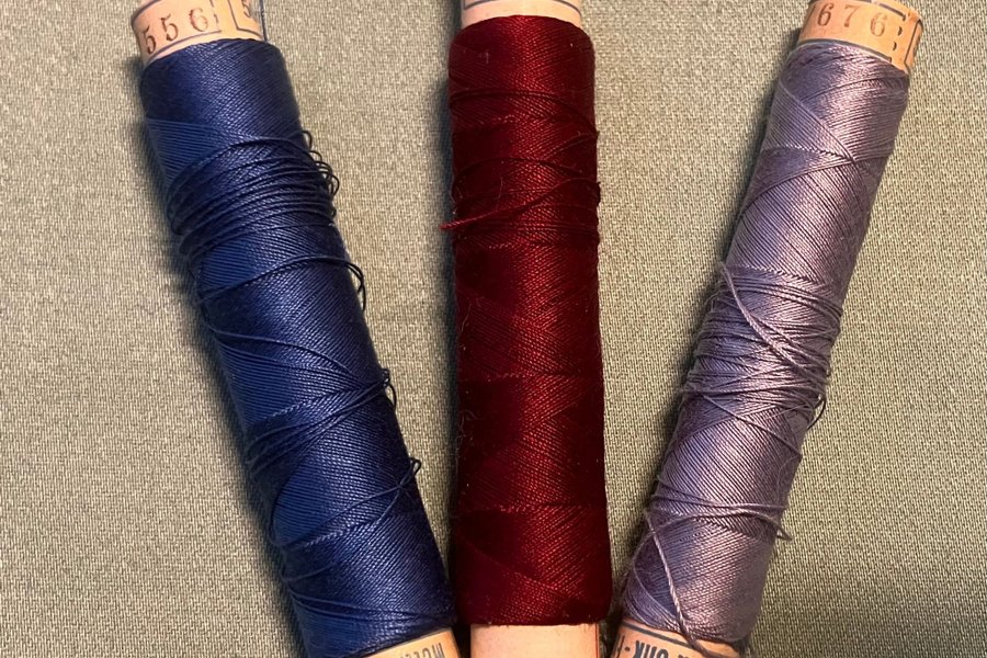 Enl bilder. Det står det Mettlers Helvetia Silk på de blå. Den vinröda Indanthren. Ser ut att vara samma typ och grovlek som 100/3. Det står 50 meter på alla. Markering från vänster till höger: 50/556, 50/601, 50/676.Det är taget på den ljusblå. Jag tror att det är taget aningen på övriga.