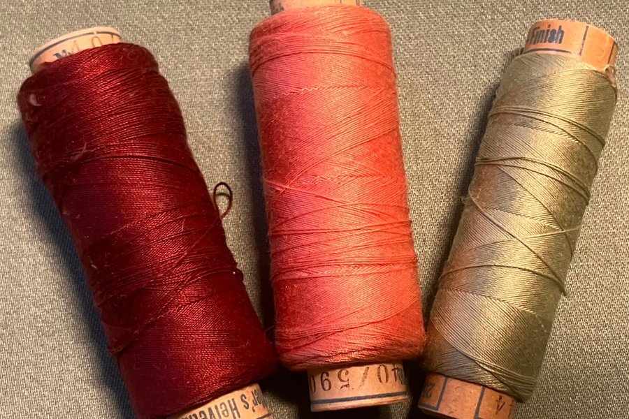 Enl bilder. Det står det Mettlers Helvetia Silk och 250 yards på alla. Ser ut att vara samma typ och grovlek som 100/3. Markering från vänster till höger: 40/659, 40/590, 40/644. Det är taget på den gröna.
