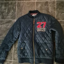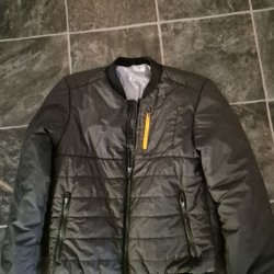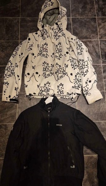 Två jackor, en vit med svart mönster och en svart bomberjacka med dragkedja. stl. 40