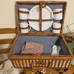 En klassisk picknickkorg i rotting med rödvitrutigt tyg invändigt. Inkluderar tallrikar och bestick.