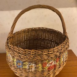 Korg rund i flätat material. Mäter cirka 30 cm i diameter och 10 cm i höjd.