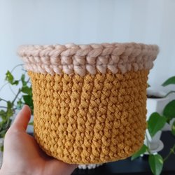 En handgjord korg i vackert glansigt guldigt material, perfekt för förvaring, ha kruka med växt i, eller som en dekorativ detalj i hemmet.
