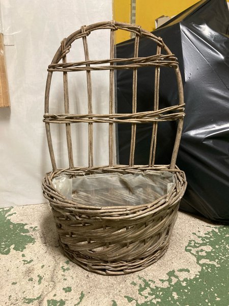Väggkorg i flätad pil med en insats av plast. Fint skick! Längd 42 cm. Bredd 27 cm.