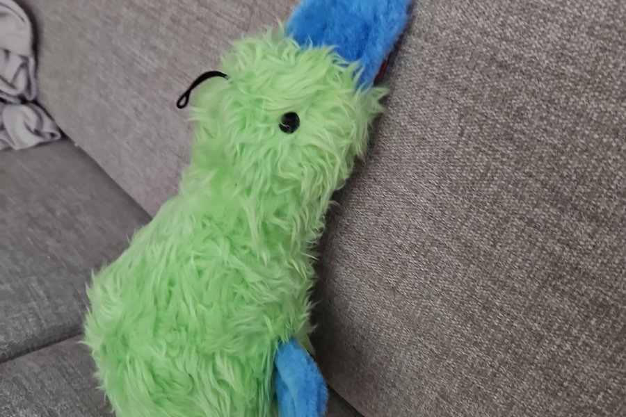 Ett gulligt gosedjur i form av ett näbbdjur. Den har en grön kropp och blå detaljer.