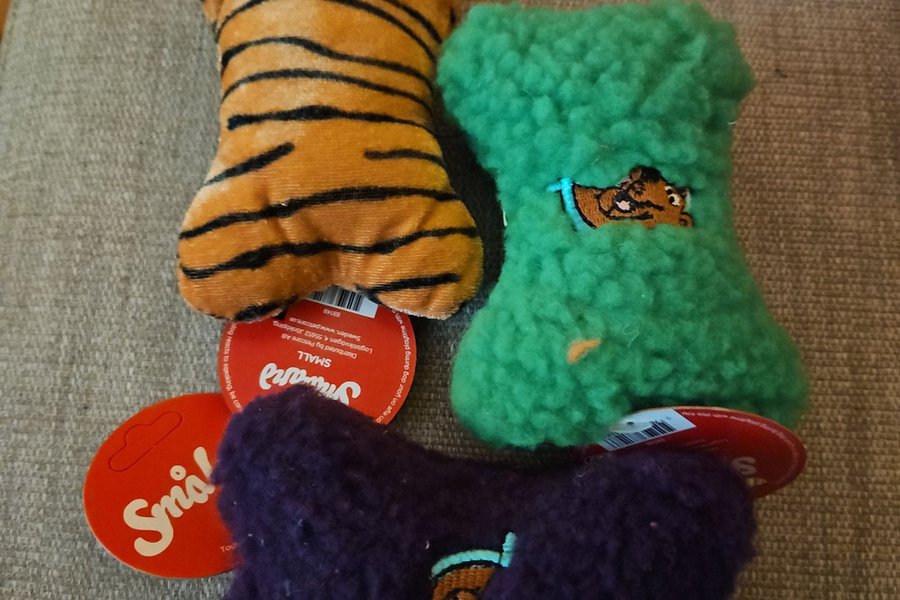 Tre små hundleksaker i form av ben. En tiger-randig, en grön och en lila med broderade motiv.