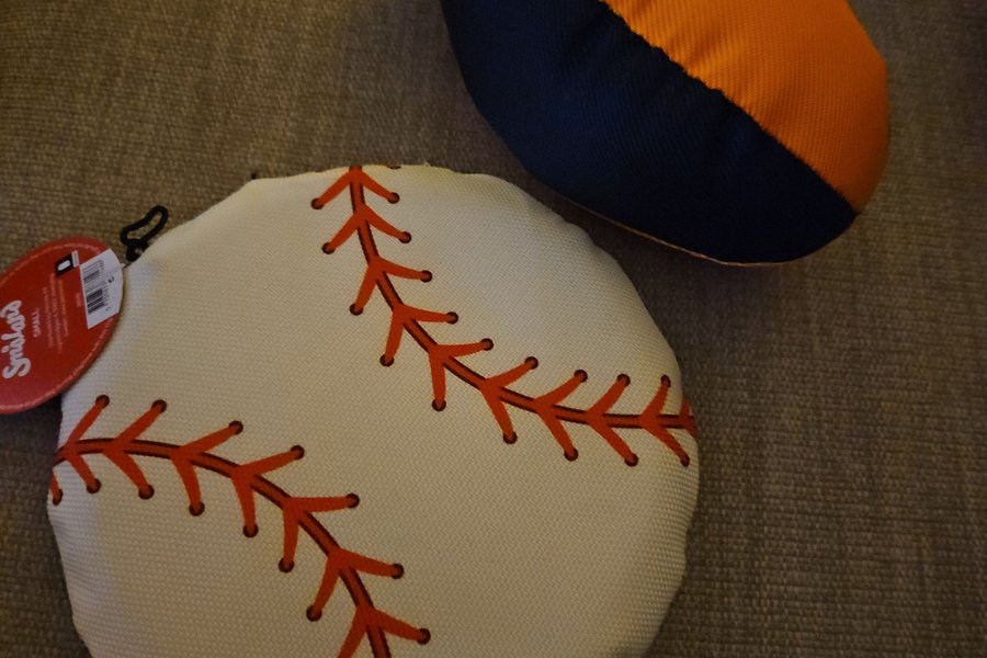 Två roliga hundleksaker från Smakers. En boll som ser ut som en baseboll och en rugbyboll.