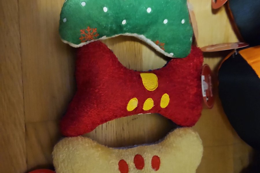Tre stycken hundleksaker i form av ben. En grön med snöflingor, en röd med gula prickar och en gul med tassavtryck.