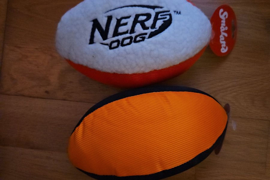 Två Nerf Dog leksaker i form av en rugbyboll. Den ena är vit och orange med texten "Nerf Dog", den andra är orange med svart kant.