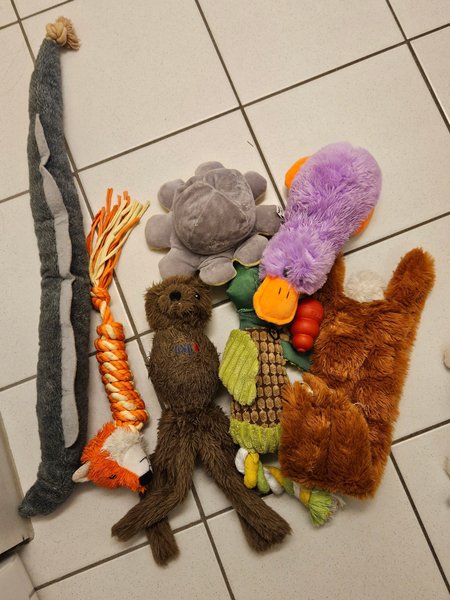 Detta parti innehåller flera hundleksaker. En grå och vit randig leksak med knut i ena änden. En orange och vit flätad repleksak med ett rävansikte i ena änden. En grå bläckfiskliknande leksak. En brun björnliknande leksak. En lila ankliknande leksak med orange näbb. En grön och brun leksak med mönster. En brun leksak med vita detaljer.