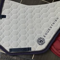Ett vitt schabrak med quiltat mönster och grå kant. Använd endast vid en tävling och tvättad. Storlek Pony.