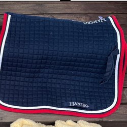 Ett vitt schabrak med quiltat mönster och grå kant. Använd endast vid en tävling och tvättad. Storlek Pony.
