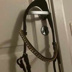 Svart träns med strassdetaljer. Har en defekt på nosgrimman, syns på bild.