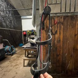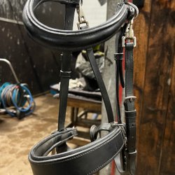 Ett enkelt svart träns i läder med mässingsfärgade spännen.