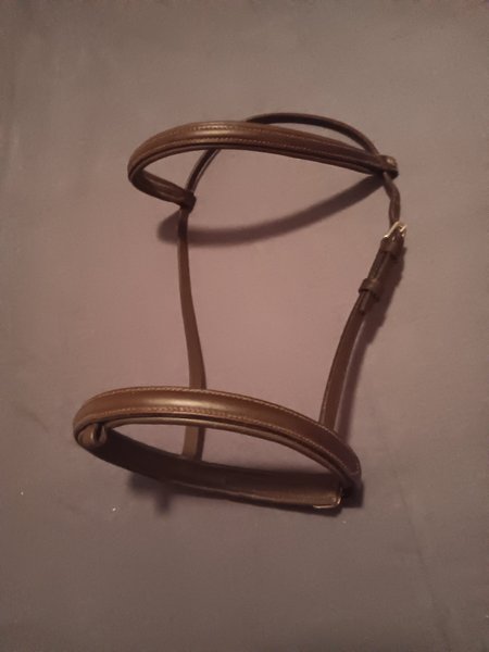 Pannband och kombinerad nosgrimma (snokrem finns även om den inte blev med på bild) i mörkbrunt läder med skinnskott pannband och nosrem, silverfärgade spännen. Elegant med smala remmar. Märke Jacson Cosmos. Stl ponny.