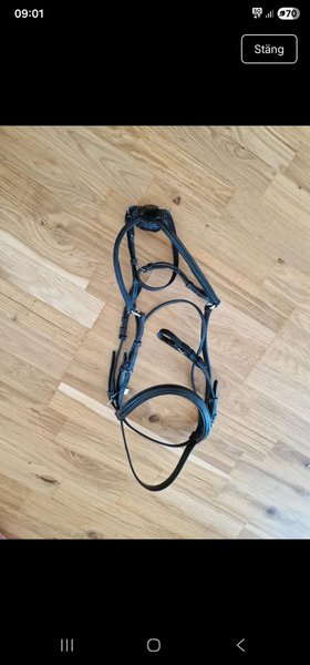 Träns i svart läder med vita sömmar. Silverfärgade spännen. storlek stor cob har suttit på häst med storlek full. Säljes I befintligt skick