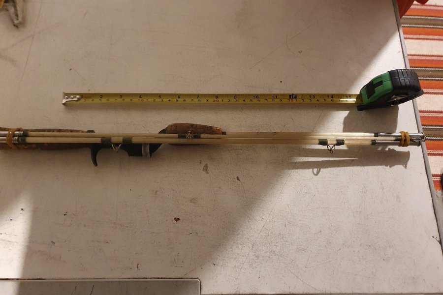 Detta fiskespö är tillverkat av glasfiber och har ett rullfäste i järn det är 3 delat . Längden på spöet kan mätas med hjälp av måttbandet som visas på bilden. Passar för fiskeentusiaster som söker ett traditionellt alternativ eller för samlaren obs det är ett spinnspö
