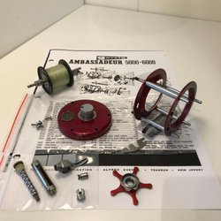 Röd ABU Ambassadeur-haspelrulle med metallvev och vevhandtag. Levereras i svart transportväska/lock med texten “Ambassadeur” och “ABU”.