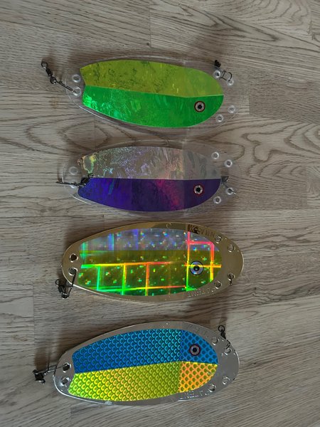 Fyra fiskespön i olika färger och mönster. Passar för fiske i olika vatten. Varje spö har unika reflektioner och design som kan attrahera olika fiskarter.