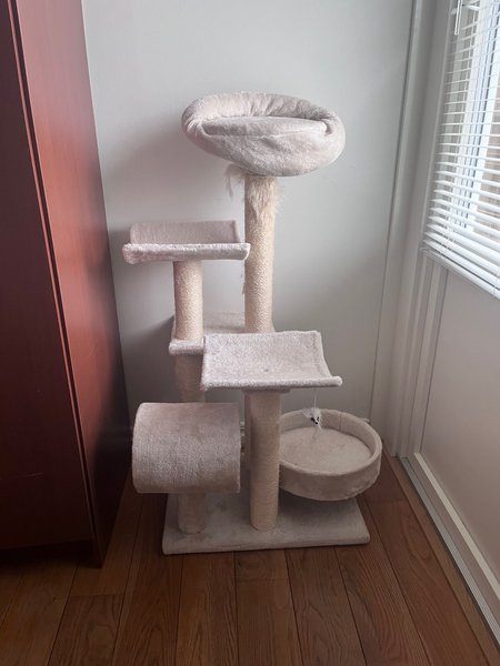 Kattklösträd med flera nivåer, klöspelare och liggplatser. Designad för att ge katter en plats att klösa, leka och vila.