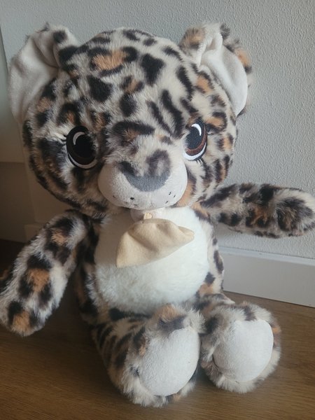 Leopard gosedjur med mjuk päls och detaljerade ögon. Gosedjuret har en beige mage och tassar.