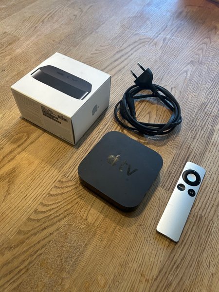 Apple TV med fjärrkontroll och strömkabel. Ingen hdmi kabel medföljer.