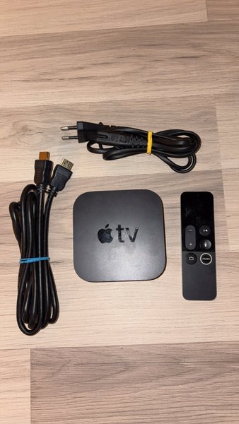 Apple TV 4K (A1625) med fjärrkontroll och strömkabel.
