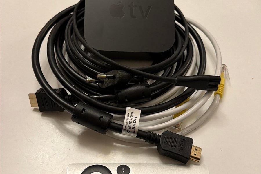 Apple TV modell A1427 med fjärrkontroll och kablar.