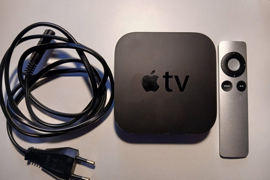 Apple TV med fjärrkontroll och strömkabel.