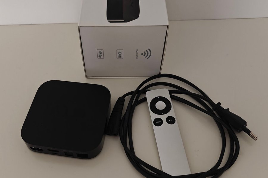 Apple TV 3 med fjärrkontroll och strömkabel. Stödjer 1080p upplösning och HDMI-anslutning. Har 802.11n Wi-Fi.Optisk ljudutgång.