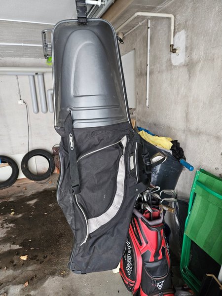 Ett golfresefodral i hårdplast och tyg, designat för att skydda golfutrustning under transport. Fodralet har hjul för enkel förflyttning och ett handtag.