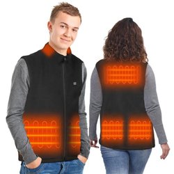 Black heated vest with a zipper closure and multiple heating zones. It features a power bank for operation and temperature control.